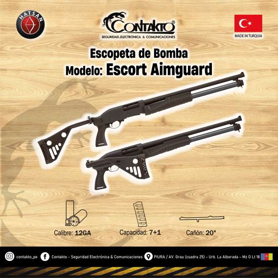 Escort AimGuard ™ y MarineGuard ™ escopetas para hogar y defensa son los caballos de batalla de larga data de la línea de defensa de HATSAN (Turquia) Estas escopetas disponen de un punto de mira de rifle de estilo cañon de 18″. El AimGuard viene con Culata sintética Plegable lateralmente color negro mate y acero pavonado, mientras que el MarineGuard tiene acabado Nickelado resistente al agua.